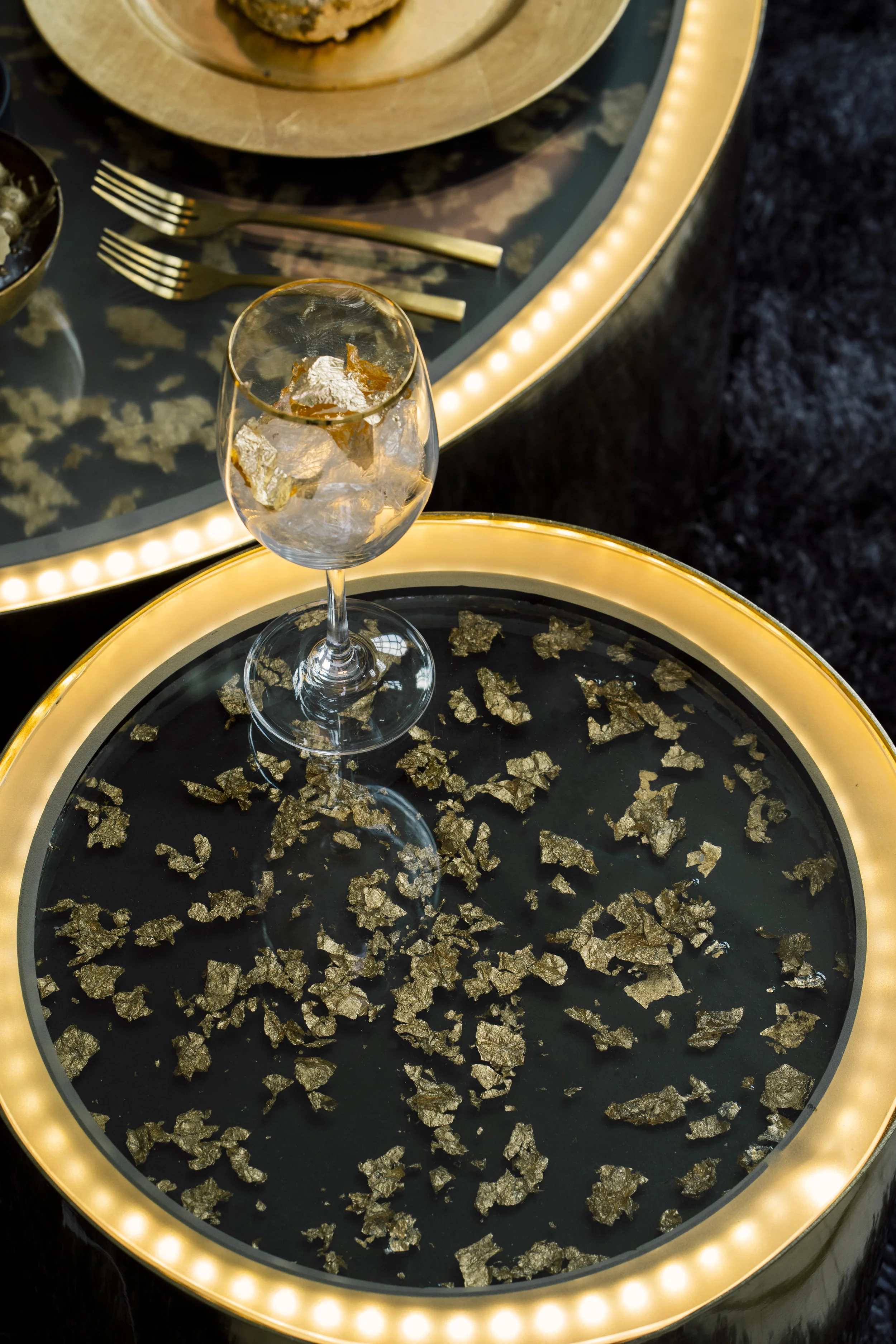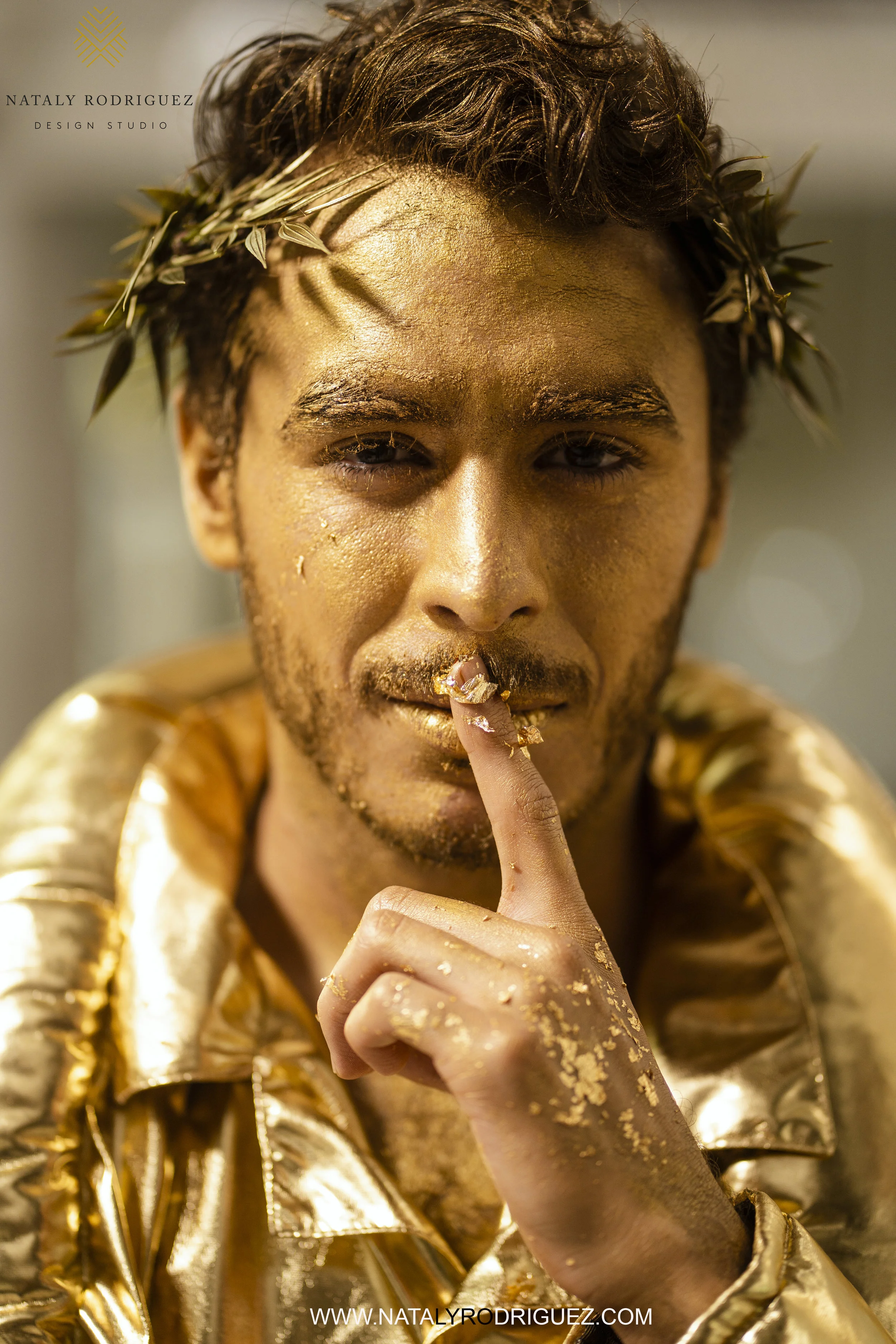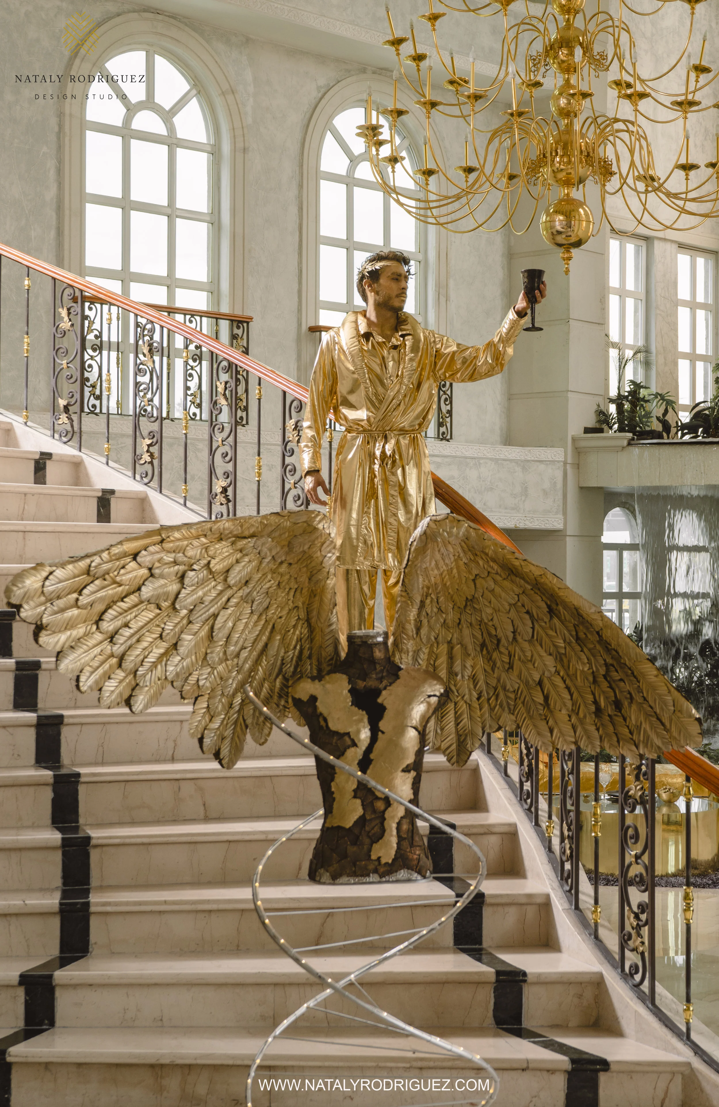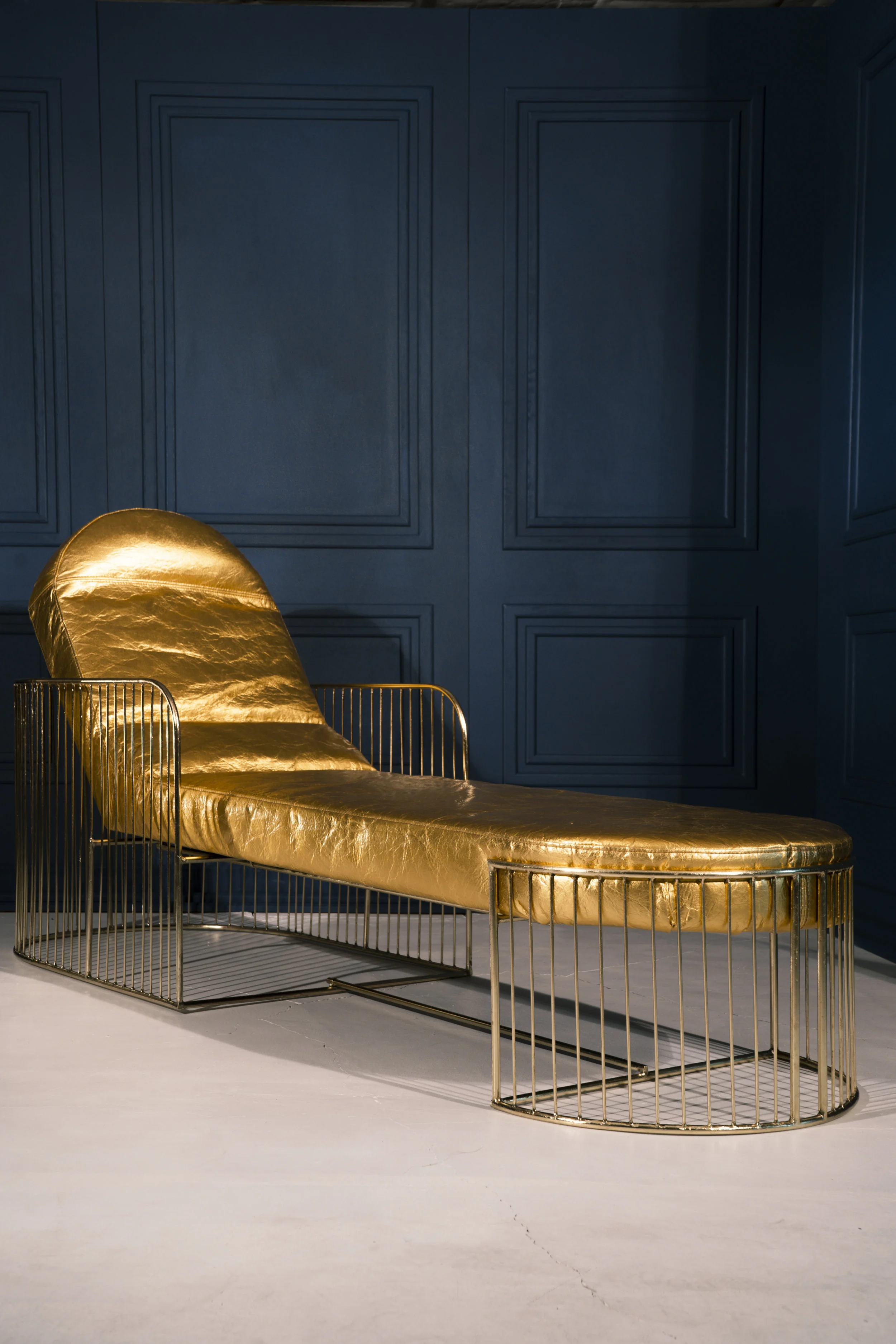 El diván MIDAS, dos coffe tables, bar cart, Narcissus (espejo) y Gaia (escultura). Hecha principalmente de metal y ofreciendo acabados latonados, hoja de oro, cristales, espejos pero lo más importante; PIEL DE PIÑA.